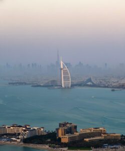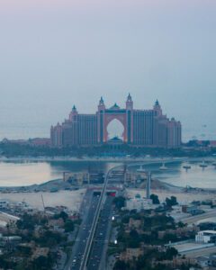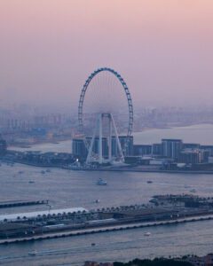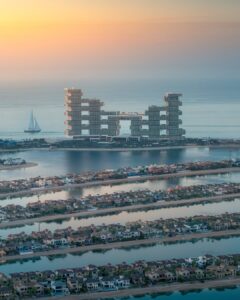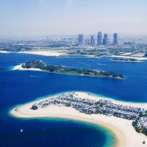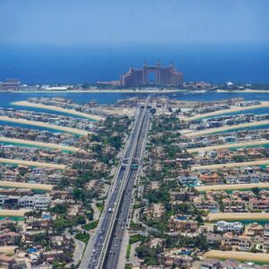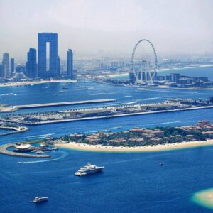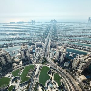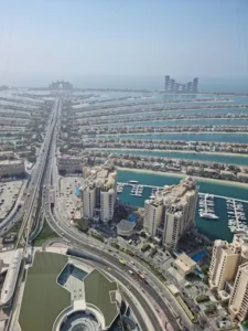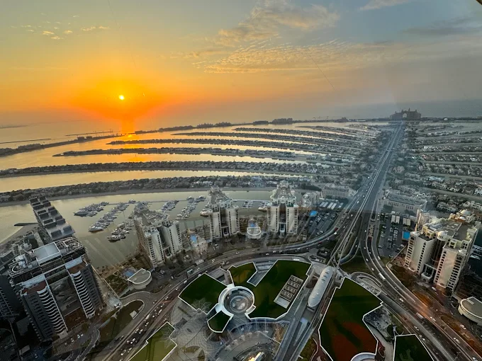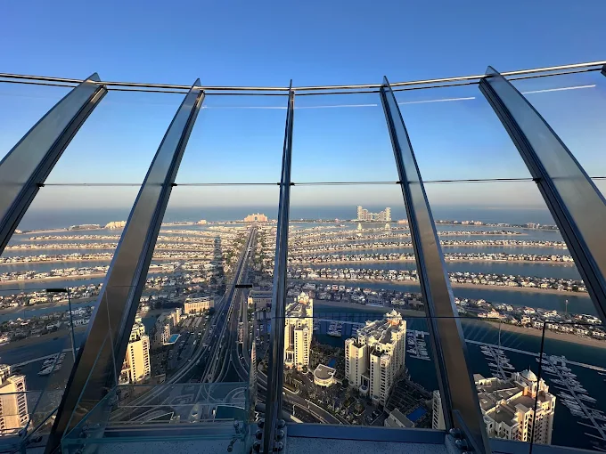 Glass-framed observation deck from a high-rise overlooking the Palm Islands, with city & gulf views.